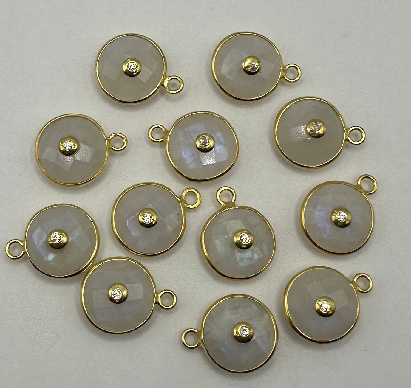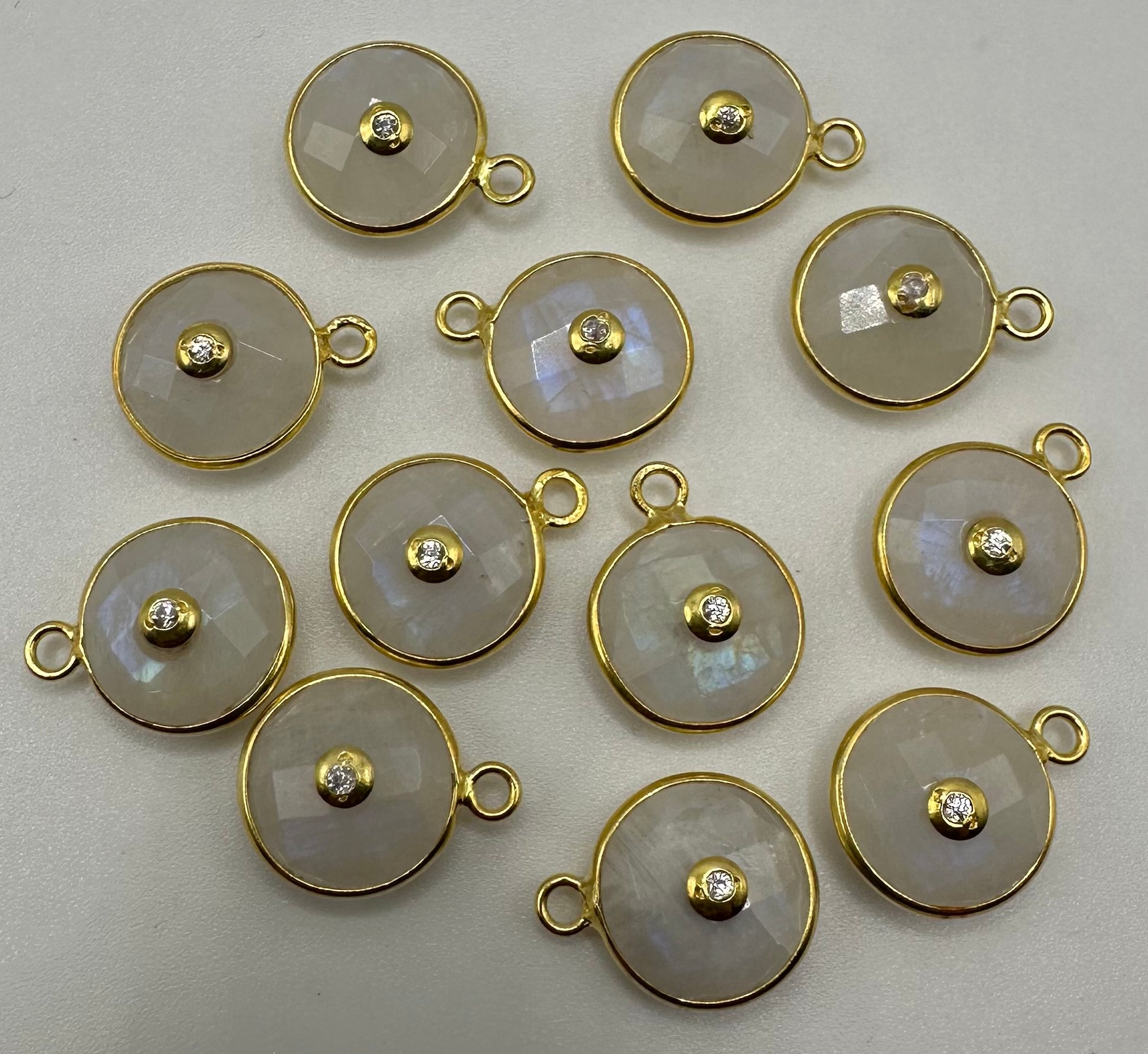 Rainbow moonstone coin 12mm 925 Vermeil bezel with 1.5CZ pendent sell by piece.